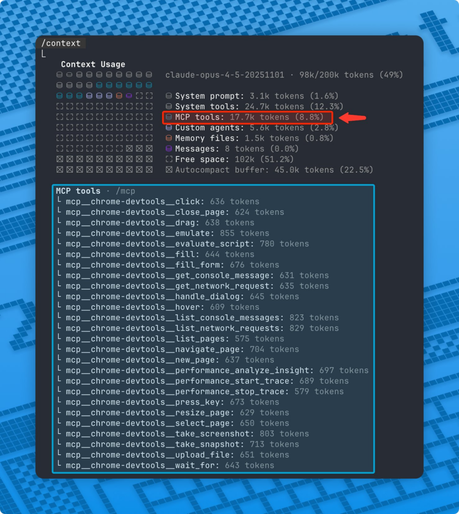 举个例子:我只装了一个 Chrome DevTools MCP,还没开始干活,上下文就没了 8.8%。浏览器类 MCP 动辄 10-20 个工具,全部加载进来,上下文直接告急。